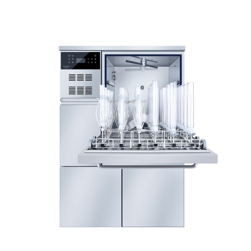 The B200 Stainless Steel Base Cabinet adopts an integrated design, which not only optimizes human-washer interaction but also expands storage functionality. Its internal space can be used to accommodate and store cleaning agents or additional basket racks, keeping the work area tidy and efficient. At the same time, the base cabinet the touchscreen to an ideal height for better visibility and operation, while providing more ample and ergonomic space for placing utensils.